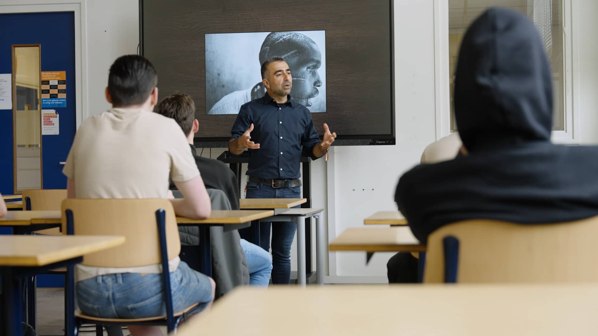 Jaser staat voor de klas en geeft burgerschapsles aan zijn leerlingen.